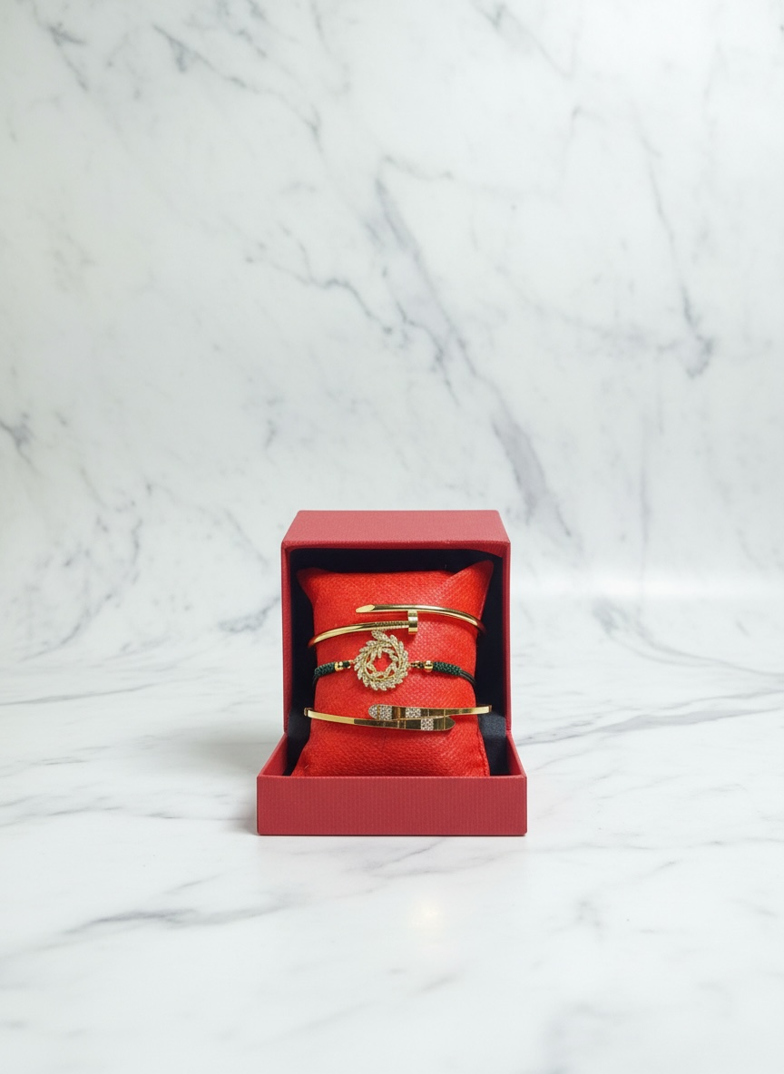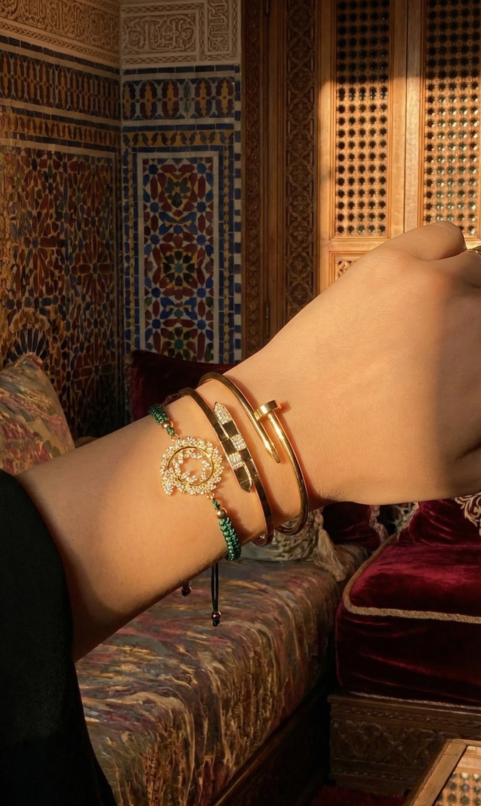 طقم يجمع بين جرأة "المسمار" ونعومة الأساور القماشية في تنسيق مثالي.
